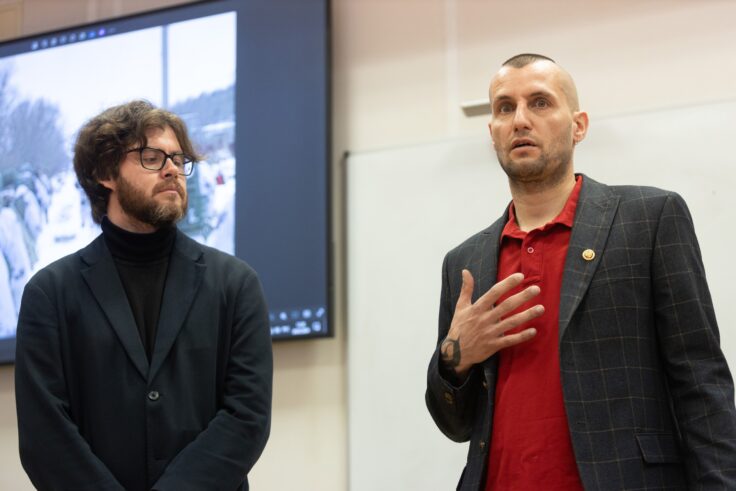 Военкор Платон Маматов (справа), декан журфака УрФУ Иван Некрасова (слева). Фото: аккаунт ВКонтакте Ивана Некрасова