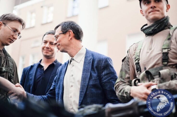 Также инициативу подхватила официальная «вышкинская» студенческая Z-организация «Белый ворон» (юные Z-активисты выбрали свое название не случайно: символ НИУ ВШЭ — ворона). Они стали регулярно организовывать сбор средств на БПЛА или, например, на системы Starlink. На общевышкинском студенческом фестивале они выступали на так называемой «бронебуханке», оклеенной Z-символикой и стикерами с «вежливыми людьми» — Никита Анисимов охотно с ними позировал. В какой-то момент молодежи Вышки, которым не импонировала эта Z-активность, послали последнее предупреждение: одну из студенток, оставившую комментарий на страницах «Белого ворона», оштрафовали за дискредитацию армии. Именно «белые вороны» представляли студентов Вышки на Петербургском международном экономическом форуме (см. фото с сессии, которая называется «Пересборка Украины: демилитаризация и денацификация»).