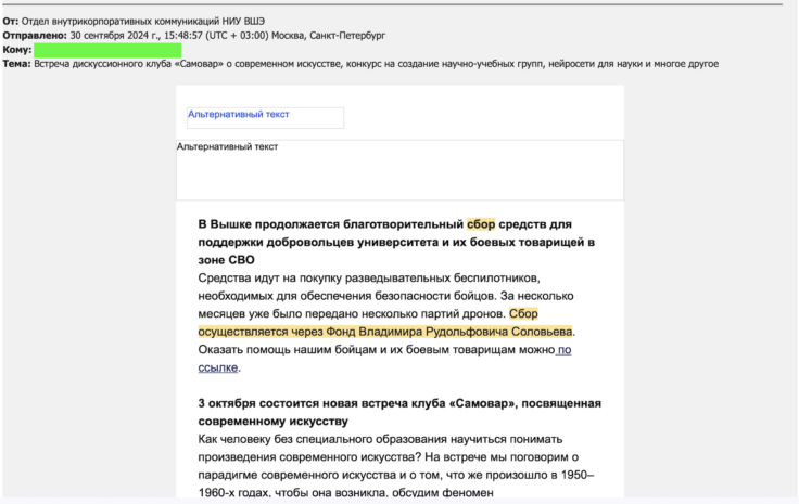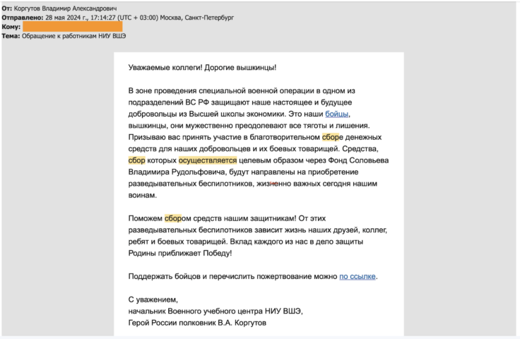 Однако позже НИУ ВШЭ перестала стесняться и поставила на поток сбор денег среди сотрудников на покупку боевых дронов. Администрация начала рассылать письма на почты всех сотрудников с призывом донатить в фонд пропагандиста Владимира Соловьева и писала об этом на своих информресурсах.