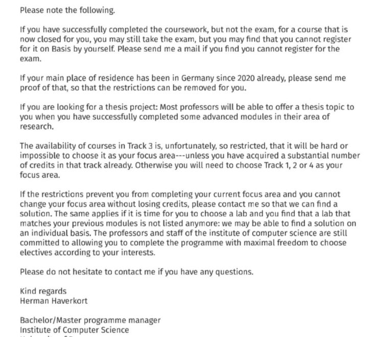 В письме написано, что если студент сможет доказать, что в последние пять лет он живет в Германии, то ограничения могут быть сняты. Из письма может показаться, что университет лишь имитирует жесткие меры, а на деле студенты все могут решить в индивидуальном порядке.