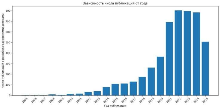При этом общая картина принципиально изменилась: теперь среди авторов совместных статей со стороны российских организаций практически отсутствуют российские имена. Их почти полностью заменили приглашенные авторы из стран Ближнего Востока. Авторские коллективы научных статей становятся более пестрыми. Дополнительно к авторам из России и Саудовской Аравии можно часто видеть аффилиации из таких стран, как Китай, Индия, Египет, Иран, Ирак. Наблюдается отсутствие устойчивых авторских коллективов. Как сообщает телеграм-канал «Зоопарк из слоновой кости» , авторские коллективы в подобных статьях представляют собой «микс из людей с совершенно разными аффилиациями, которые, скорее всего, встречаются в статье первый и последний раз в жизни, что при кросс-проверке в Scopus становится очевидным». Всё это вместе свидетельствует о том, что абсолютное большинство (около 99%) российско-саудовских работ распространяется через азиатские биржи по торговле научными публикациями и авторством в них. Данные по публикациям за 2025 год на портале OpenAlex внесены не полностью и будут добавляться со временем.