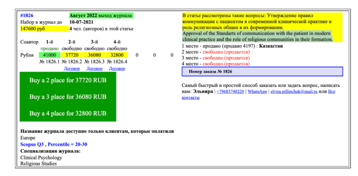 Среди лидеров соавторов статей, продававшихся на московской бирже, следует отметить юриста из Казахстана, религиоведа Константина Соколовского, руководителя Института анализа социально-политических процессов. Пример такого покупного соавторства приведен на рисунке ниже. Текст статьи во вопросам выстраивания коммуникации с пациентами и роль религиозных общин в их формировании предлагался на продажу начиная с 2021 года. Первое место в авторском списке было закреплено за ученым из Казахстана. Позже статья с таким же названием была опубликована в номере 1 журнала Mental Health, Religion & Culture за 2023 год, а ученым из Казахстана оказался Соколовский. Второе, третье и четвертое места в списке соавторов статьи приобрели сотрудники Сеченовского университета. На сайте Диссернета можно найти еще по крайней мере четыре убедительных примера участия Соколовского в торговле текстами публикаций через московскую биржу.